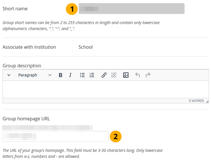 2. Group homepage URL: If the site administrator activated clean URLs, your group (homepage) has a human-readable URL which you can change to a certain extend. Choose the name for your group (homepage) if you do not like the default one. It must be 3-30 characters long. You can only use lowercase letters from a-z, numbers and - (hyphen). Your group will then be available via a URL like https://sitename/group/name-of-the-group, for example: https://mahara-university.org/group/portfolio-task-force.