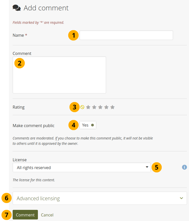 3. Rating: If the site administrator turned on comment ratings, you can use the 5-star rating scale in addition to your written comments.