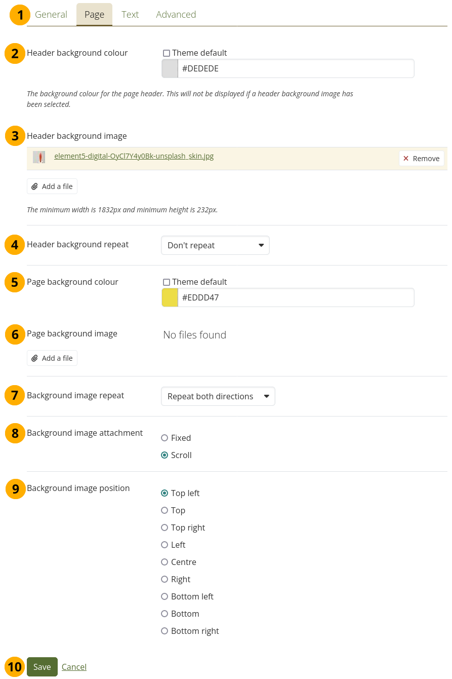 Page background image: You can display an image as background. Click the Add a file button to choose an image from your files area.