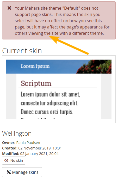 ‘Your Mahara site theme “Name of the theme” does not support page skins. This means the skin you select will have no effect on how you see this page, but it may affect the page’s appearance for others viewing the site with a different theme.’