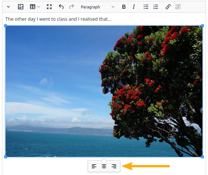 When you select an image, you can decide its alignment in the content block: left, centre, or right.