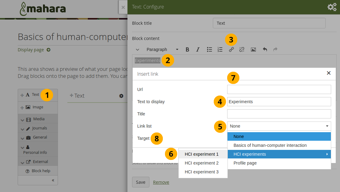 When you are in the text editor, you can link to pages on the internet and to pages within Mahara. The visual editor allows you to decide whether links shall be opened in the same window or in a new tab or window.