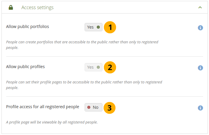 Profile access for all registered people: If this option is set to “No”, profile pages are initially viewable by all registered people, but the owner is allowed to restrict access to their institution only if they wish. Enable this option if you want to make sure everyone with an account on the site can see each others” profile pages. Profiles of institution members will always be visible to other members of the same institution.