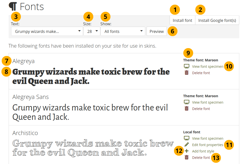 Text: Decide in which preview text the installed fonts should be displayed on this overview page. The default text is “Grumpy wizards…”: