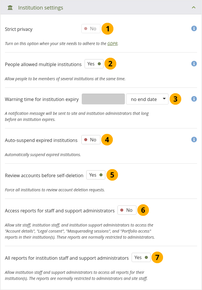 All reports for institution staff and support administrators: If set to “Yes”, institution staff and support administrators will have access to all reports in their institutions. This is normally restricted to site and institution administrators and site staff.