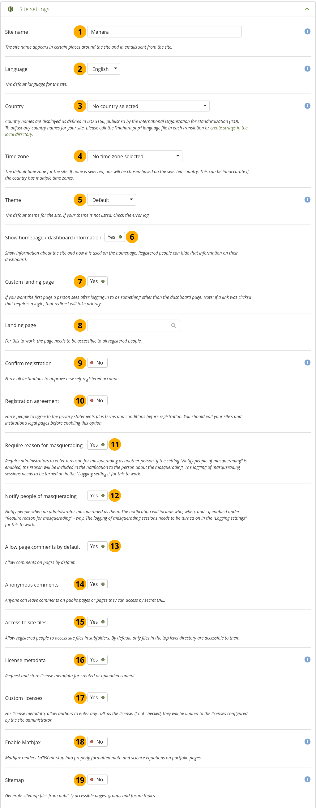 Show homepage / dashboard information: If set to “Yes”, information about Mahara and how it is used is displayed on the homepage for logged-out and on the Dashboard for registered people. Account holders can disable this for their own dashboard. See also Quick links.