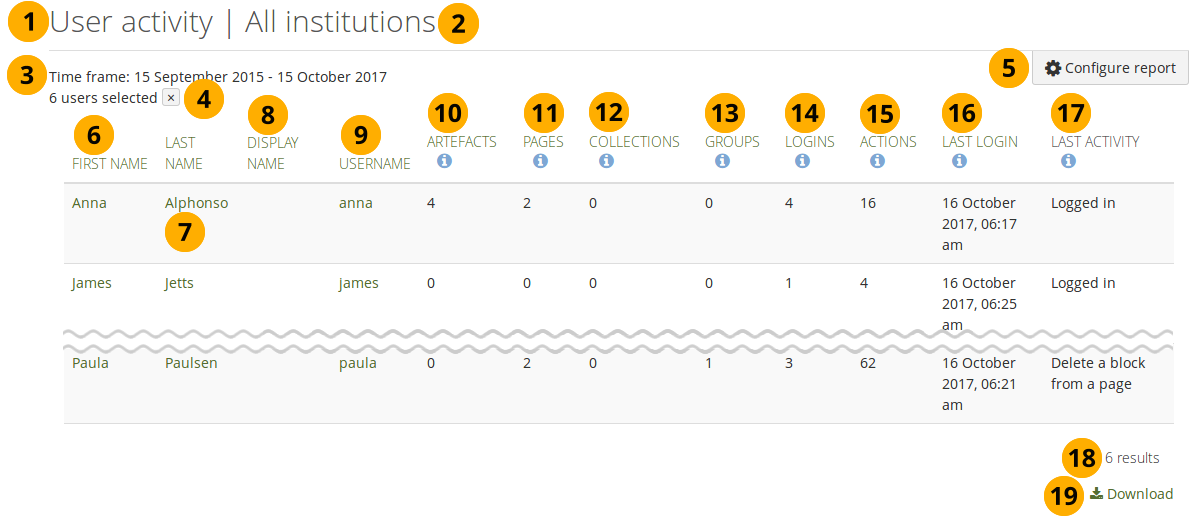 You can display the account activity for all people on the site or your chosen institution. Alternatively, you can select people on Administration menu → People → People search and report only over them: