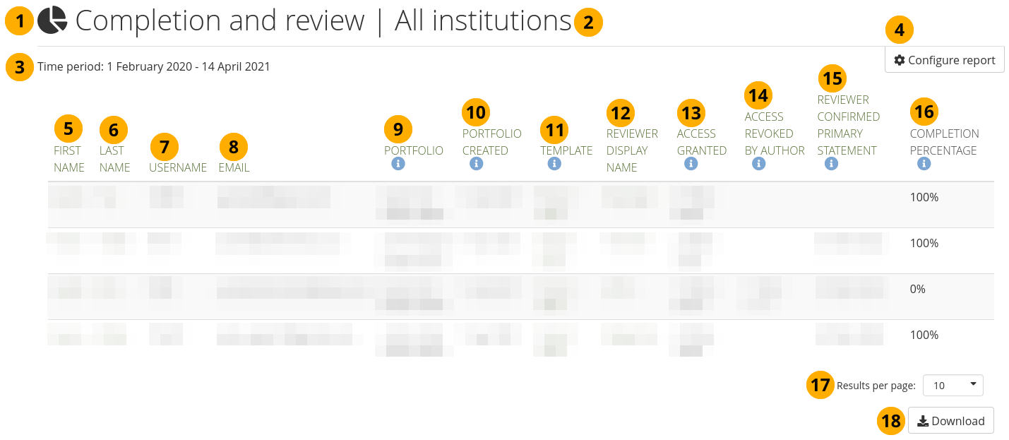 Additionally, you can decide whether you want to see results only for a particular template if you have some set up on the institution or site level and only see results where there is a reviewer assigned to a portfolio at the moment.