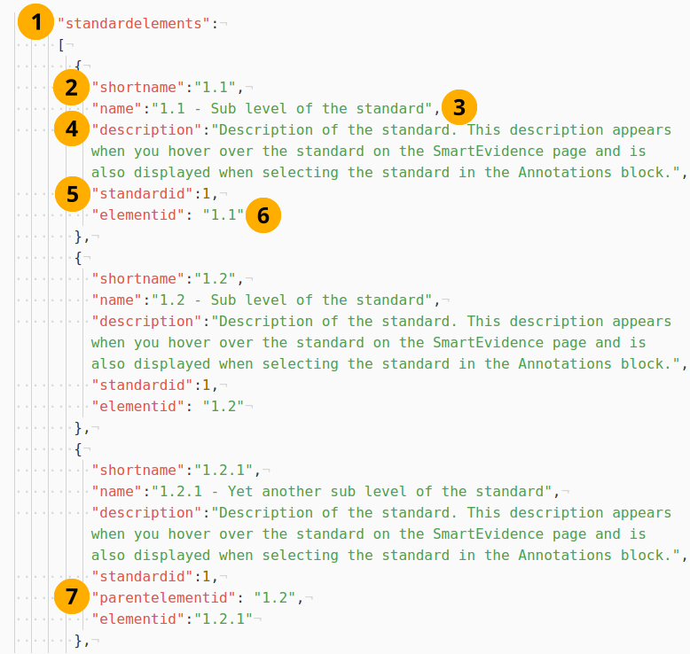parentelementid: Provide the elementid of the parent standard element if the standard element that you set up is on a level lower. The ID needs to be placed between quotation marks.
