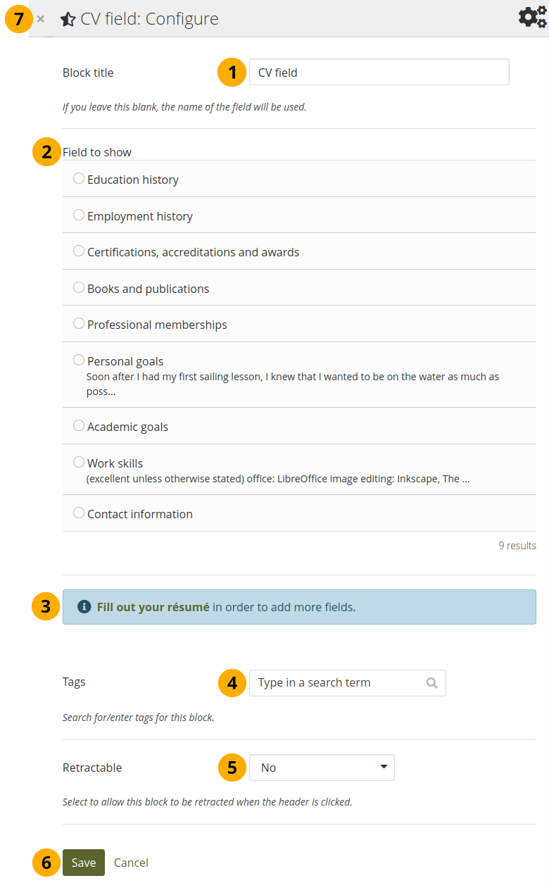 Block title: The title of the résumé field you want to display is chosen automatically unless you provide a different one.