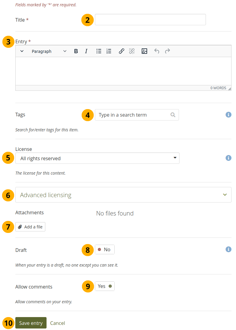 Advanced licensing: You see this option if the site administrator turned on license metadata. If you click it, you see two additional license fields, “Licensor” and “Original URL”, that you can fill in if this in not your own journal entry.