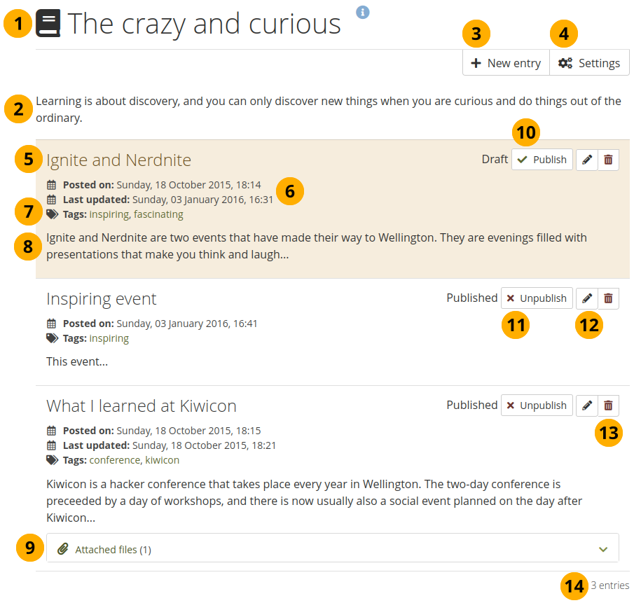 If a journal entry is labelled Draft, only you can view it. You can then click the Publish button to publish this entry to your journal for others to see when it is included in a page.