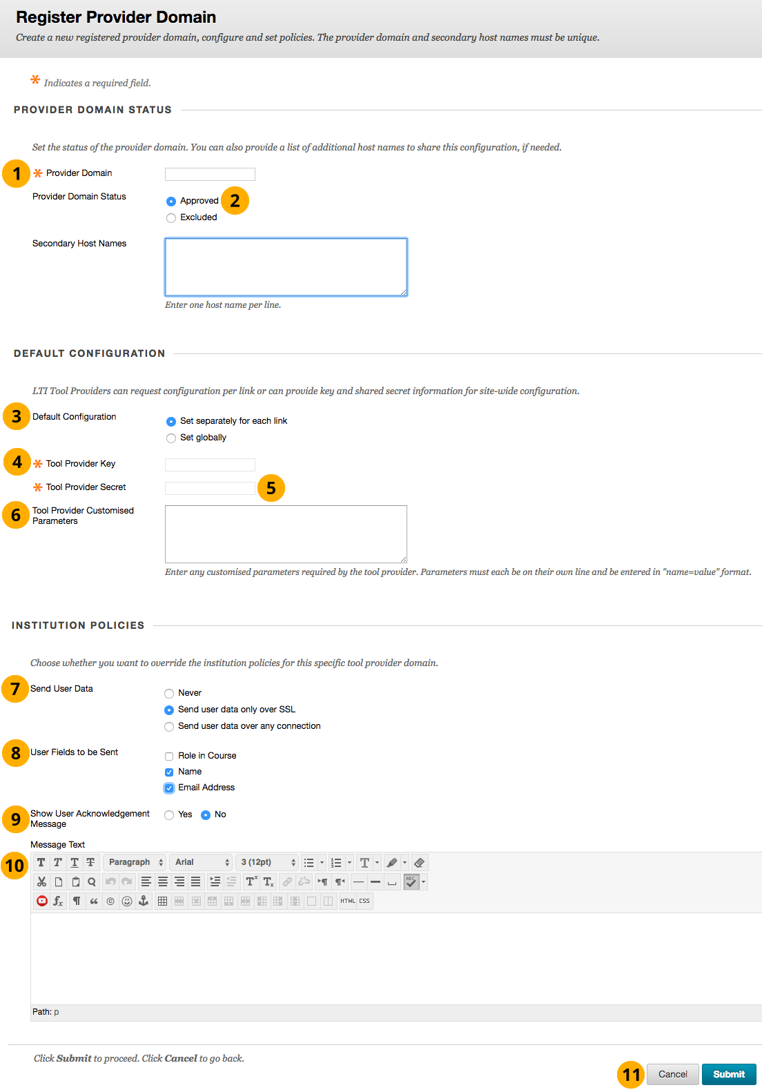 Provider Domain Status: If you want to use the LTI connection, you should select “Approved”.