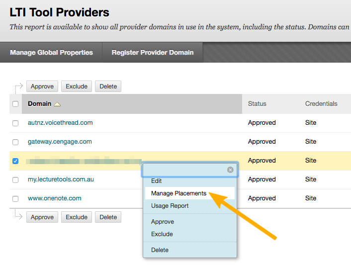 When you are back on the LTI Tool Providers screen, make a right mouse click on the Mahara URL and select Manage Placements in order to create a placement for your courses. On the following screen, click the Create Placement link.