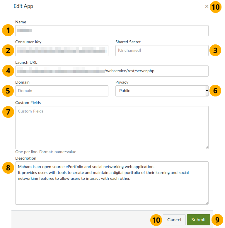 Shared Secret: Paste the consumer secret from Mahara for the LTI connection that you set up earlier.