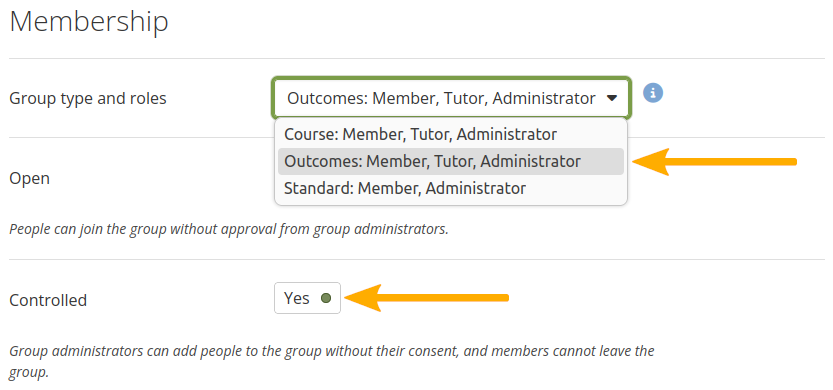 When the group type “Outcomes” is enabled in the “Plugin administration” and in the institution settings, you can select “Outcomes” in the Group type and roles when you set up a group. Automatically, it becomes a “Controlled” group.
