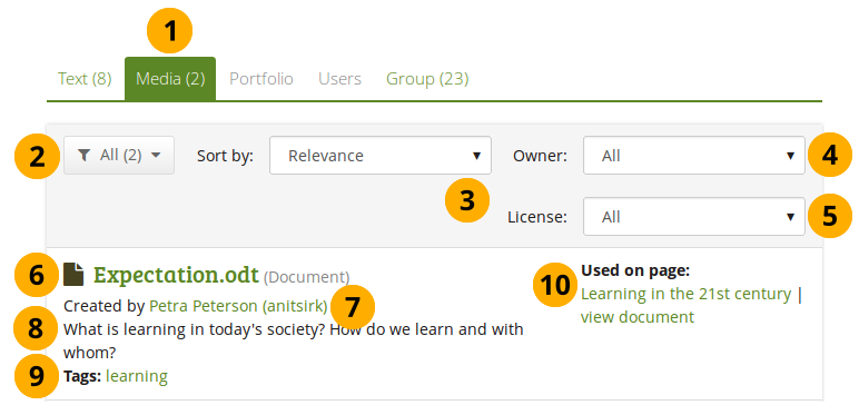 The Media facet lists results from media artefacts that you have uploaded or created.