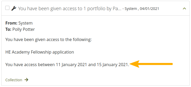 If you select individual people or a group with whom to share your portfolio, they will receive a notification. That notification contains a link to your portfolio. If you restricted access for your portfolio to a particular time, that time frame is mentioned in the notification as well.