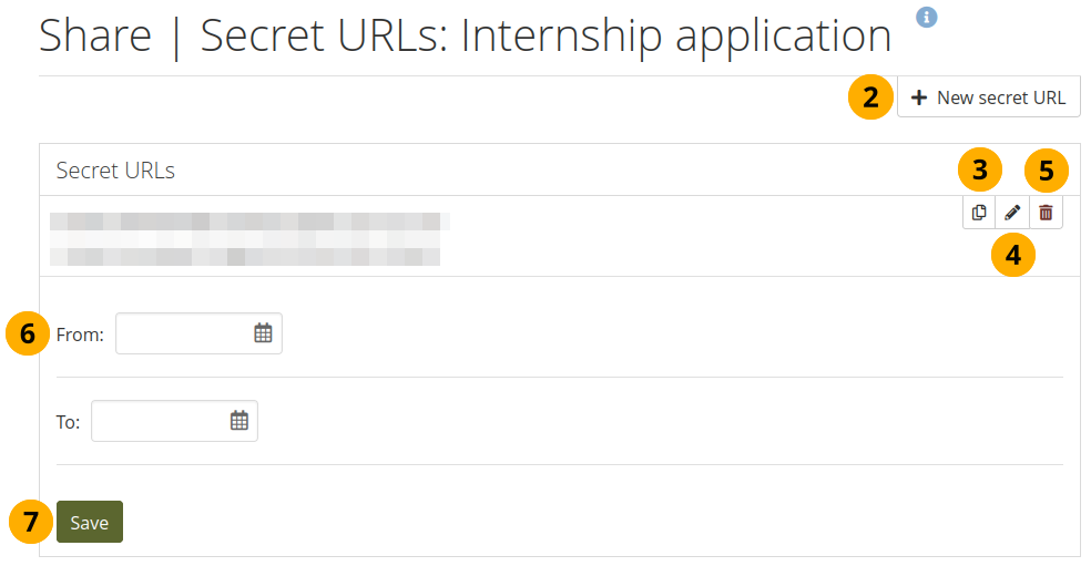 Secret URLs: The Secret URL edit icon next to each collection or page allows you to set up one or more secret URLs for a page or collection. The number of secret URLs that you have generated is displayed next to the icon.