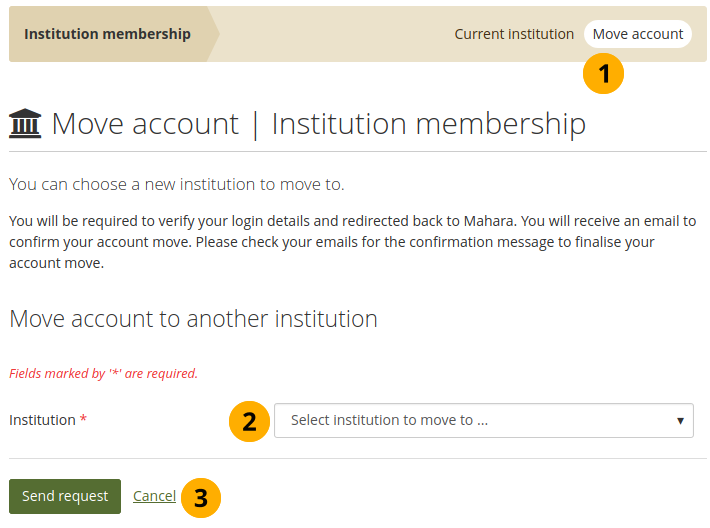 Click the Send request button, and the institution administrator is notified of your request and will deal with it.