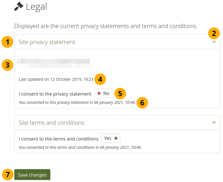 Your previous decision of consent is displayed. If you do not consent to the text any more, e.g. because it was updated with unfavourable terms, flip the switch to 『No』.