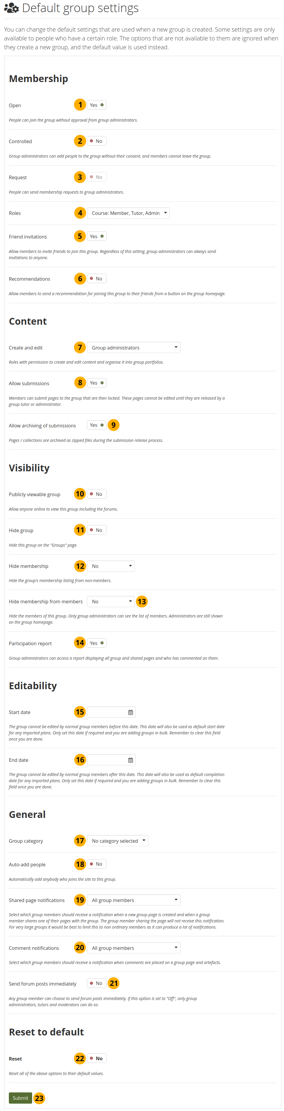 submitpages: Choose to allow the submission of portfolios to this group. If you create a course group, this setting is automatically chosen.