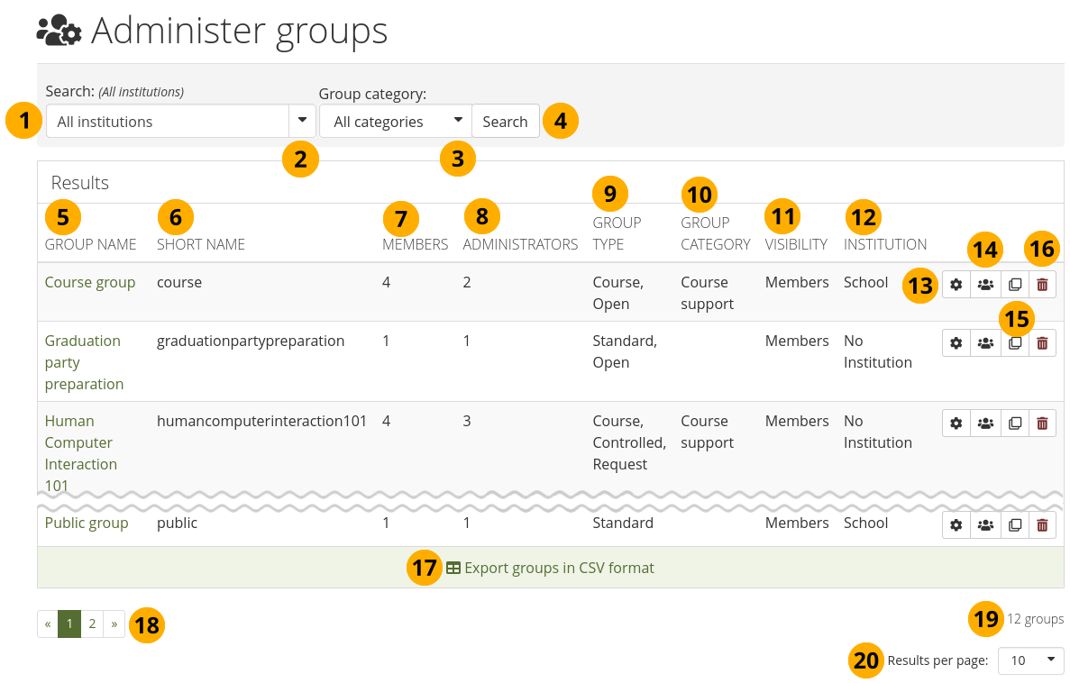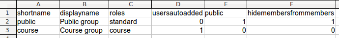 "shortname","displayname","roles","usersautoadded","public","hidemembersfrommembers""public","Public group","standard",0,1,1"course","Course group","course",1,0,011.5.6. Update group members by CSV¶