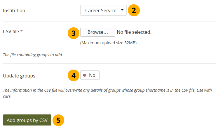 CSV file: Choose the CSV file from your computer that contains the groups.