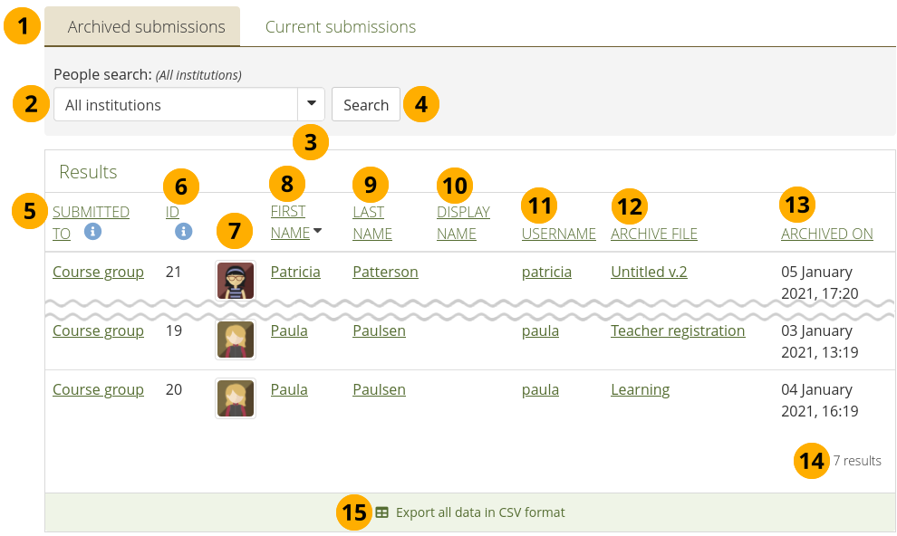 Click the Export all data in CSV format link to download data about the archived submissions. The CSV file contains the following information:
