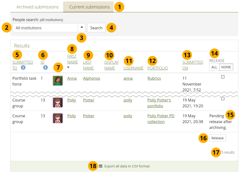 When an author submits a portfolio to a group in Mahara or an assignment in the LMS, it is displayed here.