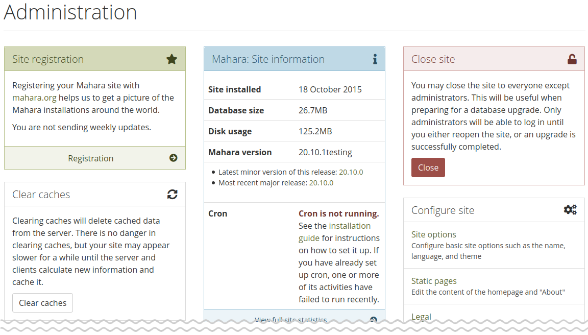 The cron job is very important in Mahara as a number of vital tasks are only performed when it is running. You can find more information of how to set it up on the wiki. If the cron is not running, that information is displayed in red. If specific cron tasks fail, they are listed.
