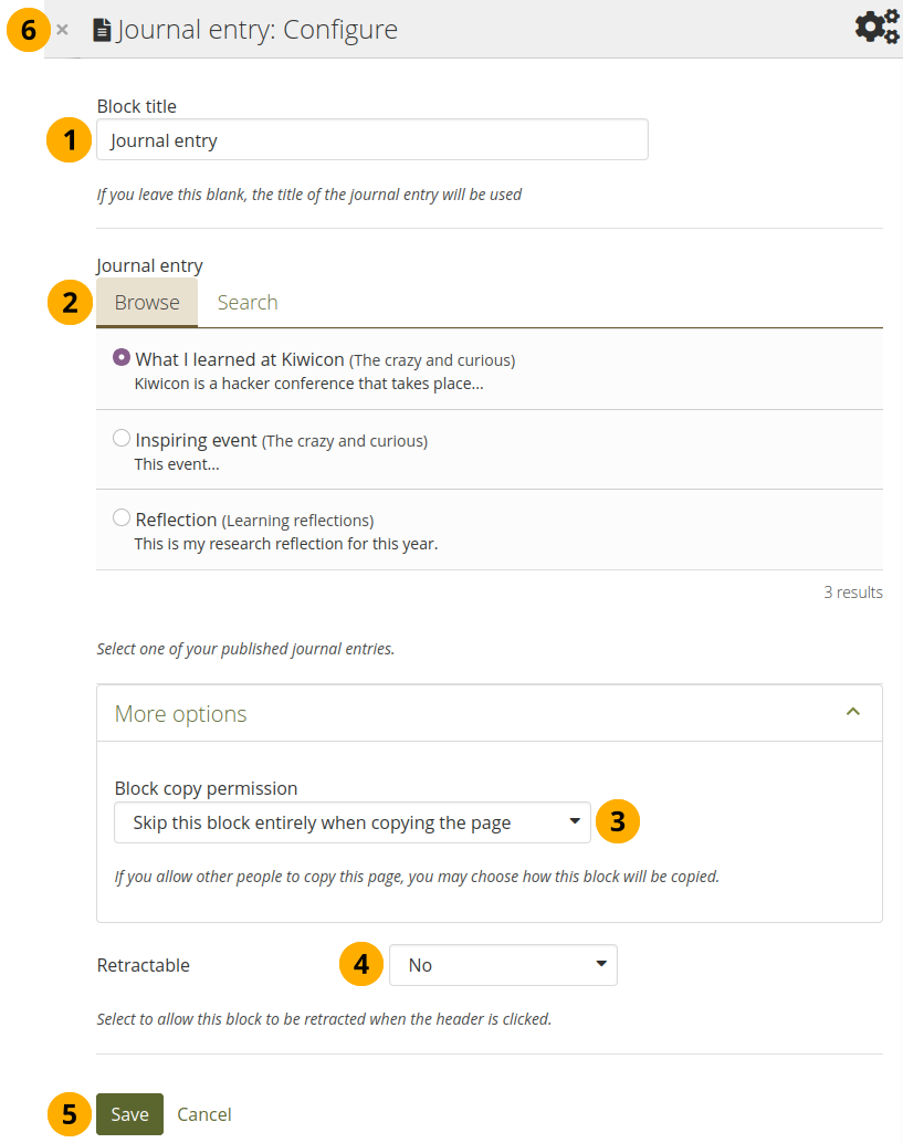 Display recent journal entries across all your journals on your portfolio page. You can use this block also in group, institution and site pages.