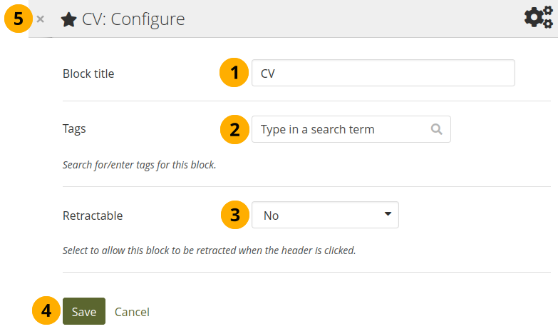 Block title: The title of the résumé field you want to display is chosen automatically unless you provide a different one.