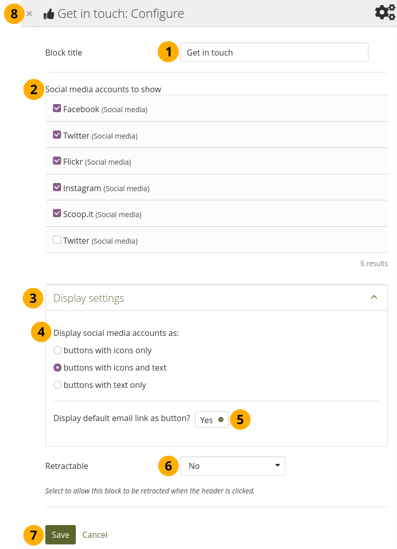 Display social media accounts as: Decide which way you want to display the links to your social media accounts:
