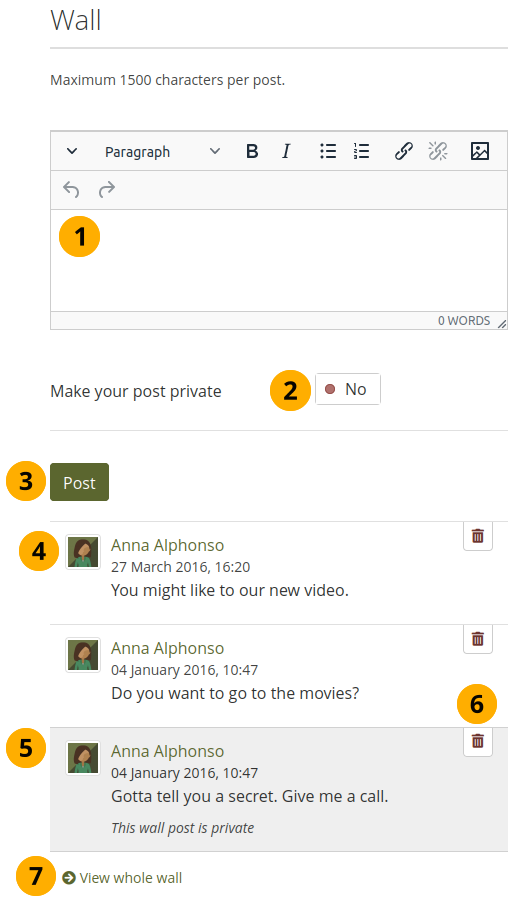 Click the Delete icon if you do not want to have a specific post on your wall. The post authors and you as owner of your wall can delete posts.
