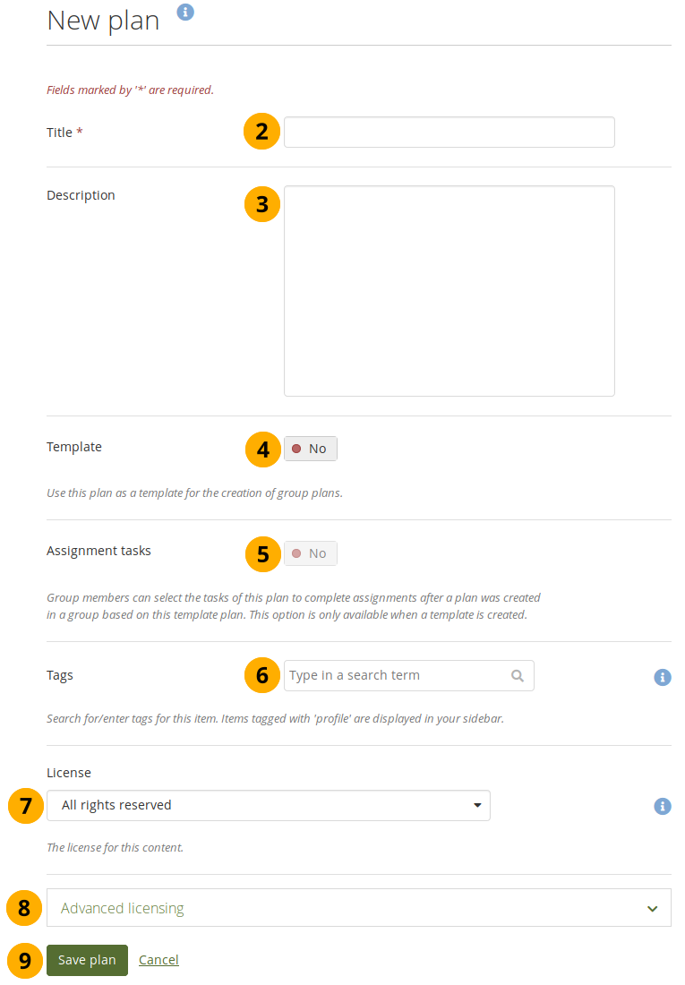 License: You see this field if the site administrator turned on license metadata. Choose the license for the plan. You can set your default license in your account settings.