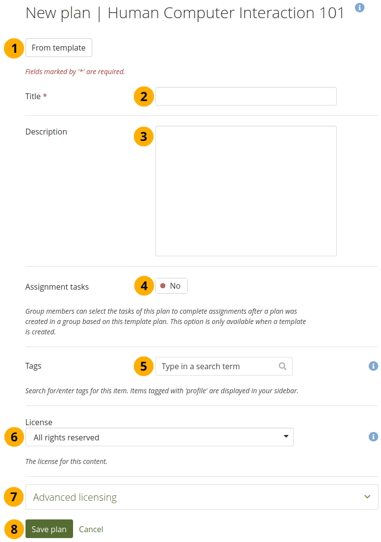 License: You see this field if the site administrator turned on license metadata. Choose the license for the plan. You can set your default license in your account settings.