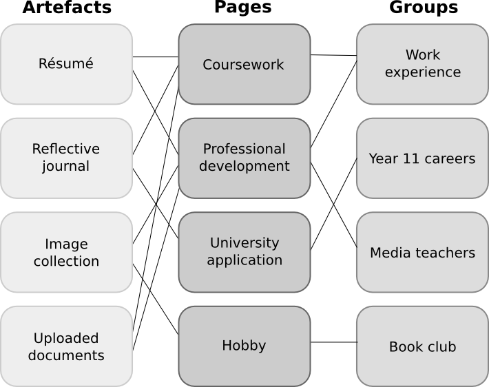The diagram below of example artefacts, pages and groups illustrates how content in Mahara can be shared and reused in different contexts and for different audiences.