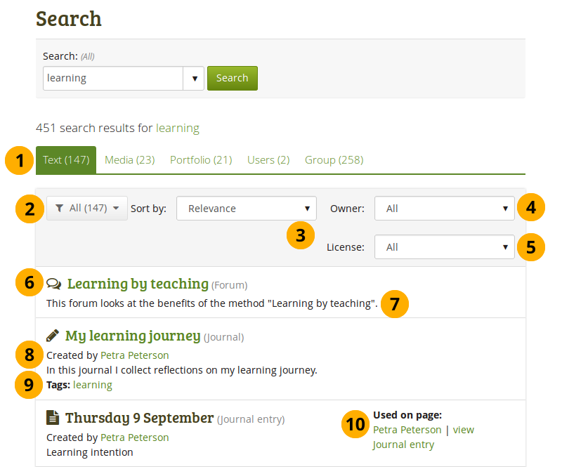 The regular Mahara search is limited to finding people and in certain places titles, descriptions and tags of pages or collections. However, Mahara can be extended to allow for full-text search capabilities. The Mahara core project team chose to use Elasticsearch. This is a powerful and extensible full-text search engine.