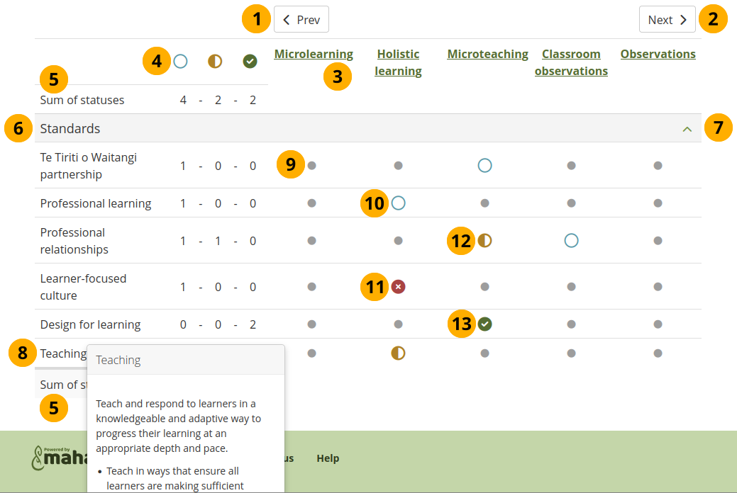 The 『Meets the standard』 option cannot be removed. It is always displayed. However, the other statuses don’t have to be displayed. The numbers in the columns indicate how many times a particular status has been used for a particular standard.