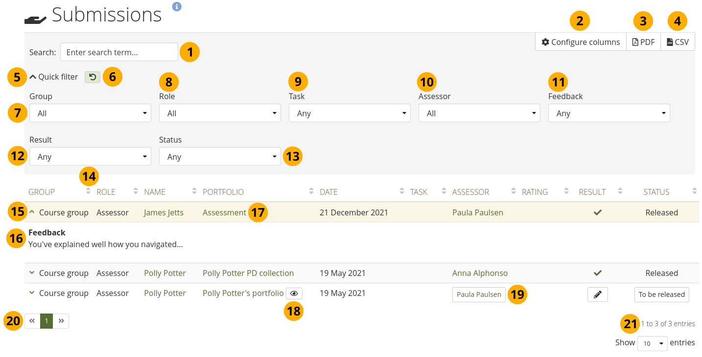 The paginator allows you to navigate between the pages of the submissions if there are lots of them.