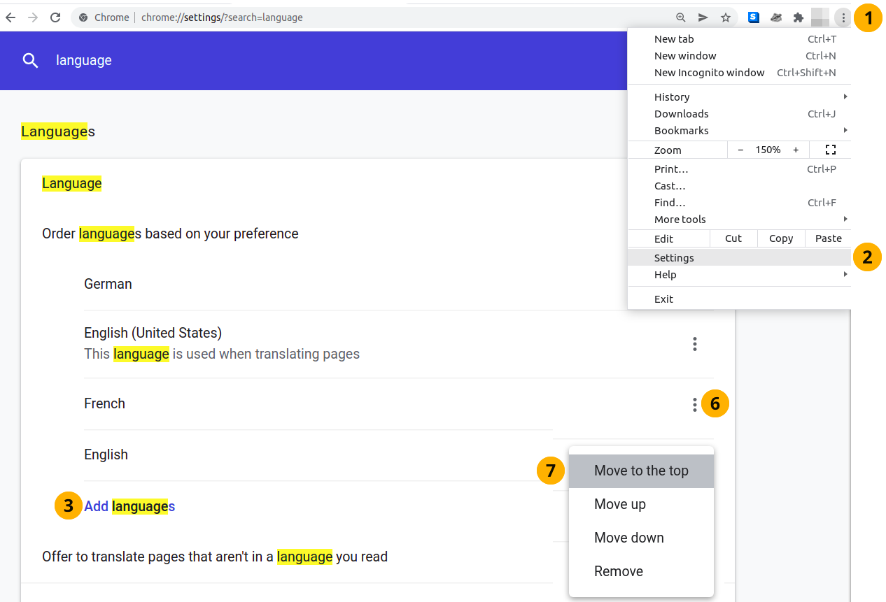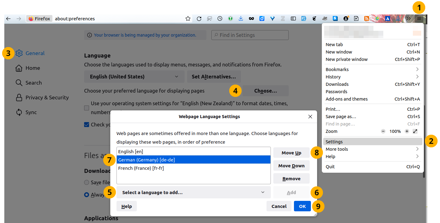 In Mozilla Firefox, the following steps allow you to set your browsing language.