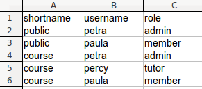 "shortname","username","role""public","petra","admin""public","paula","member""course","petra","admin""course","percy","tutor""course","paula","member"Notitie