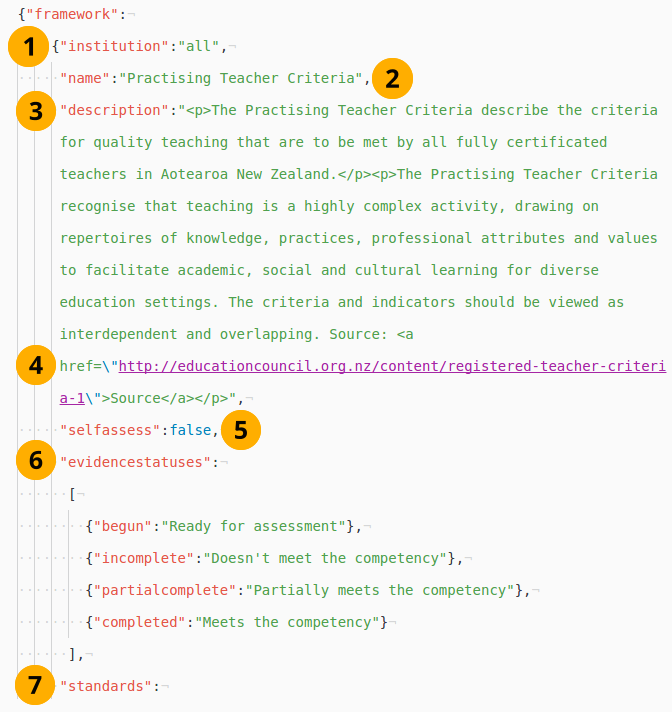 You can use any text editor to create and edit your SmartEvidence framework files. If you have an editor that supports syntax highlighting for JSON files, you have an advantage as you can differentiate text that you can change from prompts that Mahara needs to interpret the file.