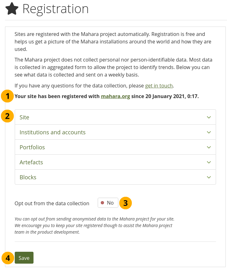 As of October 2022, all Mahara sites are automatically registered with the Mahara project when they are updated to the latest minor point release or upgraded to Mahara 22.10 though you can opt out of the data collection.