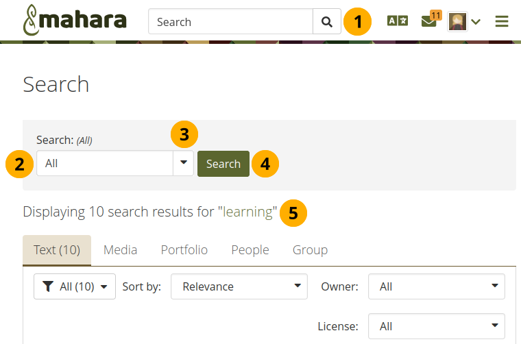 The regular Mahara search is limited to finding people and in certain places titles, descriptions and tags of pages or collections. However, Mahara can be extended to allow for full-text search capabilities. The Mahara core project team chose to use Elasticsearch. This is a powerful and extensible full-text search engine.