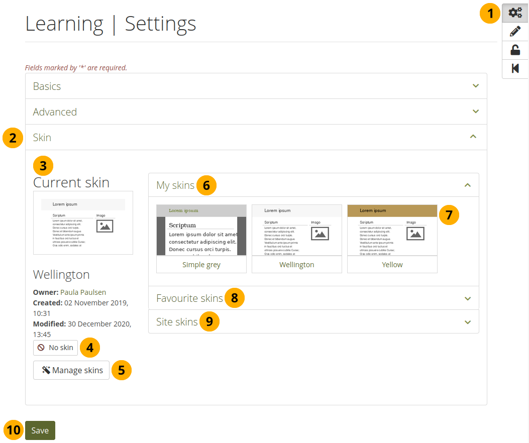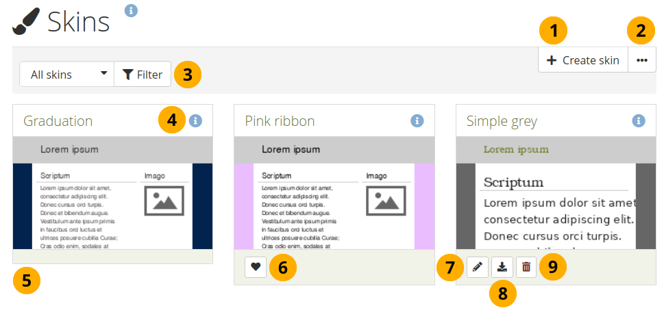 In the following, the individual skin settings will be described. A skin is applied on top of the theme that is currently used for a page. You do not have to change all settings for a skin but can pick and choose which elements you want to overwrite in the theme.